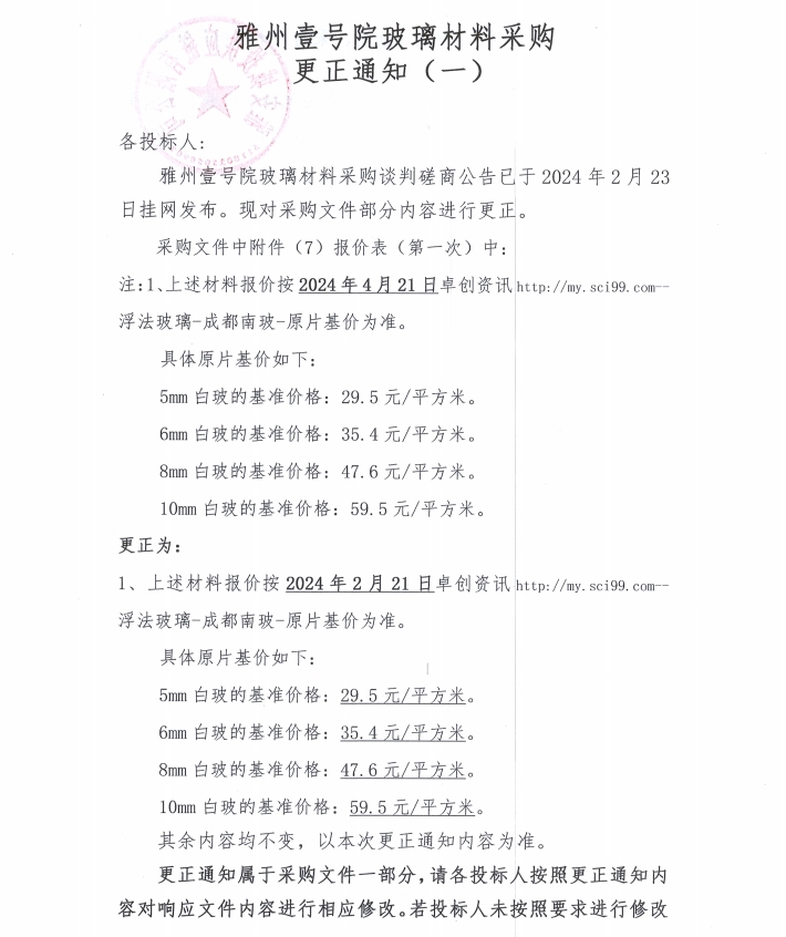 雅州壹號(hào)院玻璃材料采購(gòu)更正通知(一)