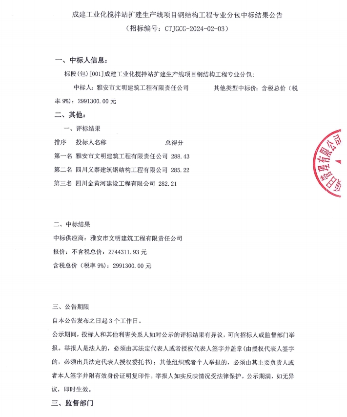 成建工業(yè)化攪拌站擴建生產(chǎn)線項目鋼結構工程專業(yè)分包中標結果公告
