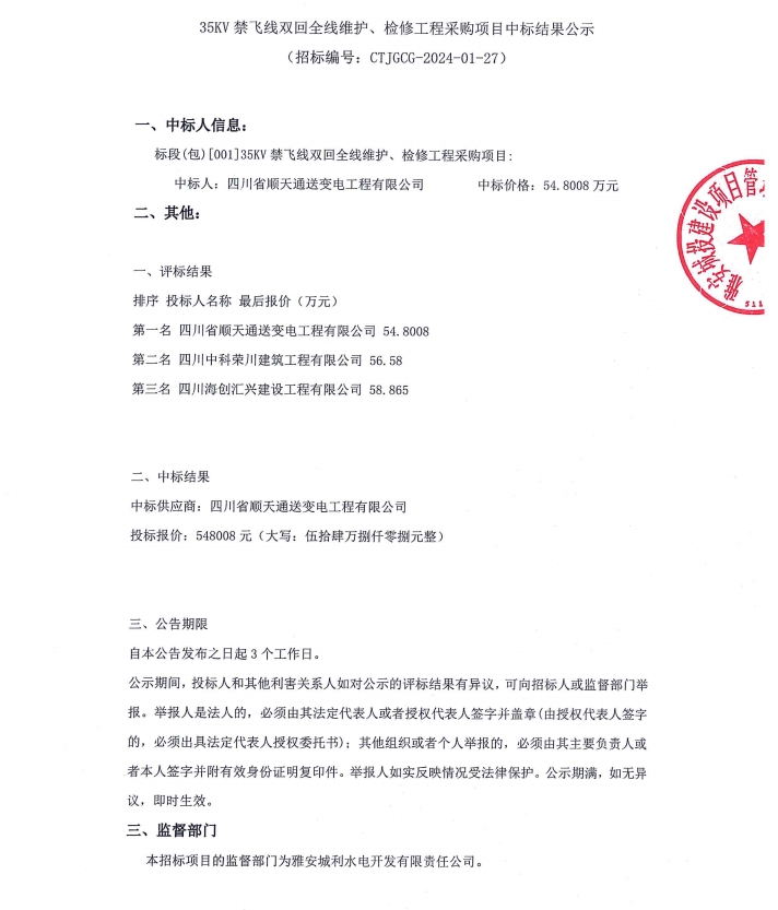 35KV禁飛線雙回全線維護(hù)、檢修工程采購項目中標(biāo)結(jié)果公示
