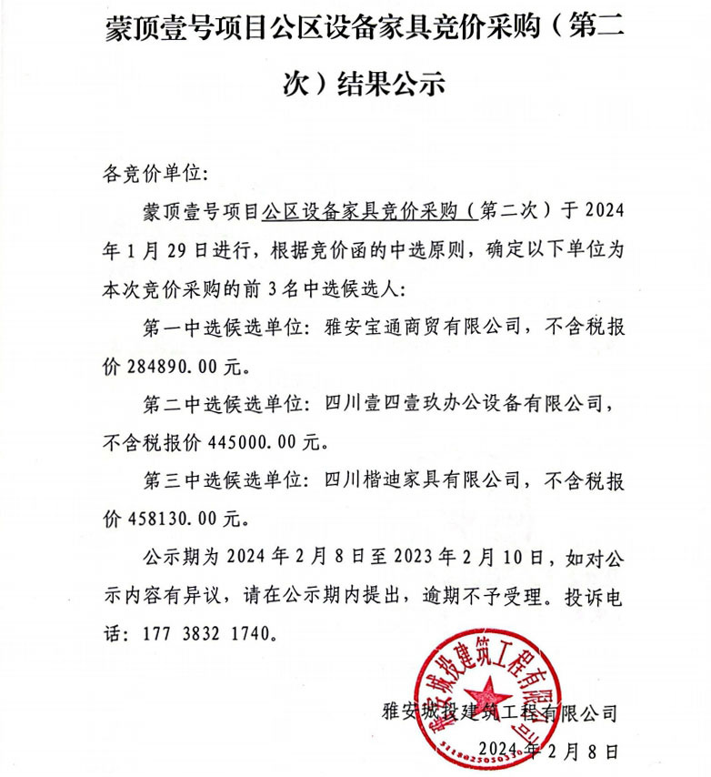 蒙頂壹號項(xiàng)目公區(qū)設(shè)備家具競價(jià)采購(第二次)結(jié)果公示