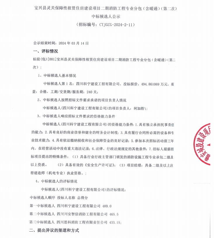 寶興縣靈關保障性租賃住房建設項目二期消防工程專業(yè)分包(含暖通)(第二次)中標候選人公示
