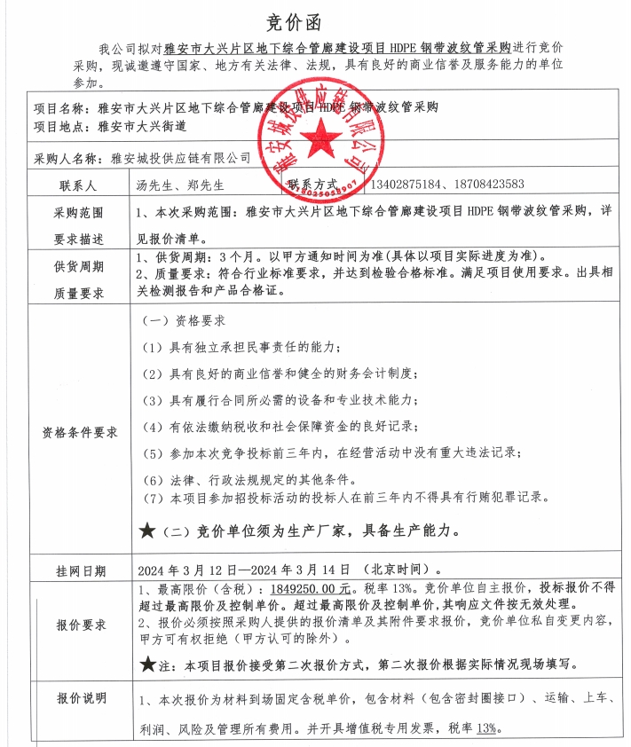 雅安市大興片區(qū)地下綜合管廊建設(shè)項目HDPE鋼帶波紋管采購競價公告