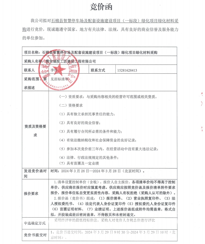 石棉縣智慧停車場(chǎng)及配套設(shè)施建設(shè)項(xiàng)目(一標(biāo)段)綠化項(xiàng)目綠化材料采購競(jìng)價(jià)公告