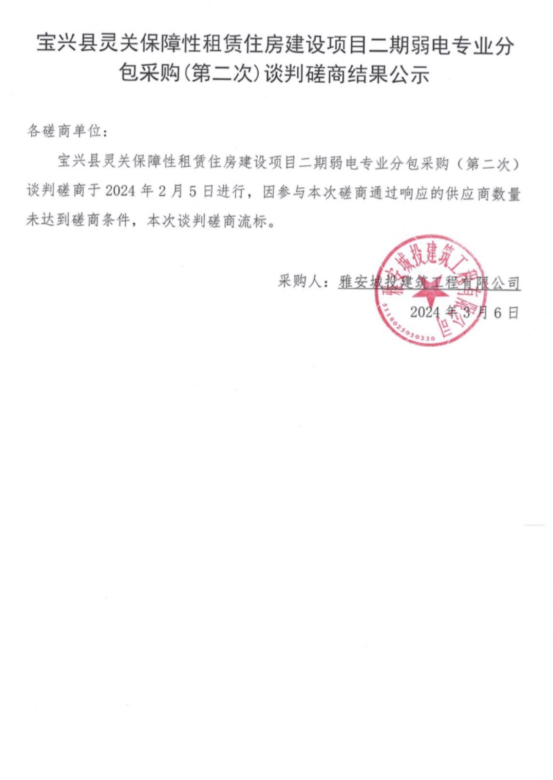 寶興縣靈關鎮(zhèn)保障性租賃住房建設項目二期弱電專業(yè)分包采購(第二次)談判磋商結果公示