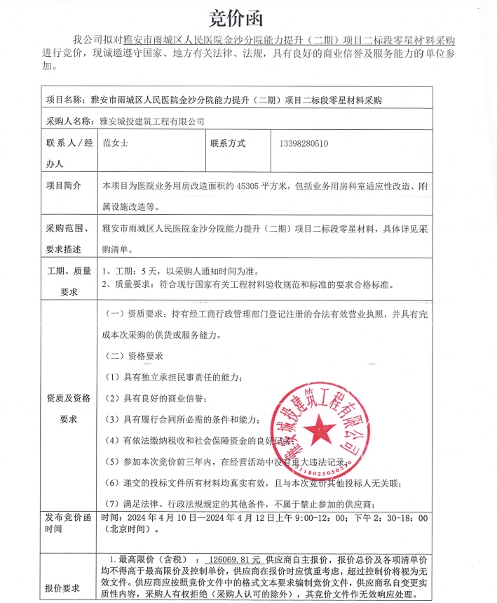 雅安市雨城區(qū)人民醫(yī)院金沙分院能力提升(二期)項(xiàng)目二標(biāo)段零星材料采購(gòu)競(jìng)價(jià)公告