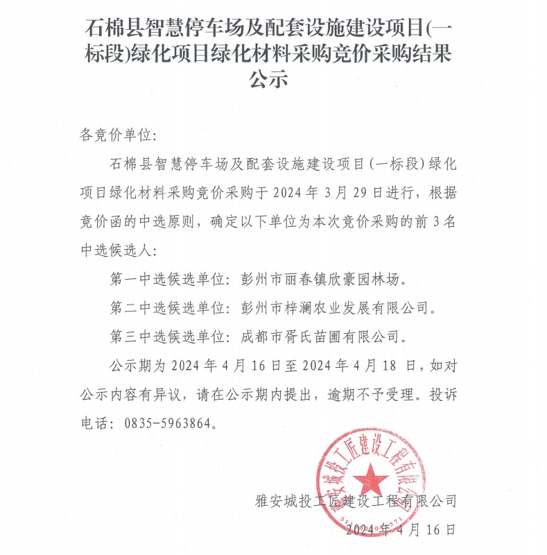 石棉縣智慧停車場及配套設施建設項目(一標段)綠化項目綠化材料采購競價采購結(jié)果公示