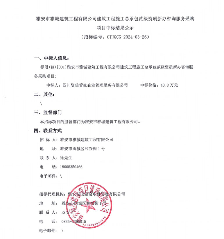 雅安市雅城建筑工程有限公司建筑工程施工總承包貳級(jí)資質(zhì)新辦咨詢(xún)服務(wù)采購(gòu)項(xiàng)目中標(biāo)結(jié)果公示