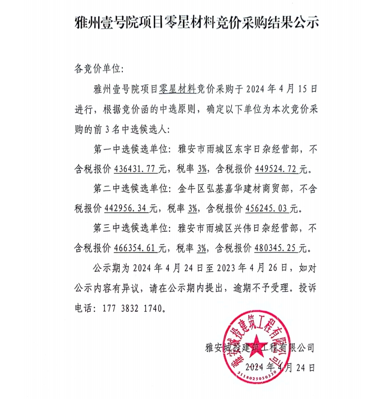 雅州壹號(hào)院項(xiàng)目零星材料競價(jià)采購結(jié)果公示