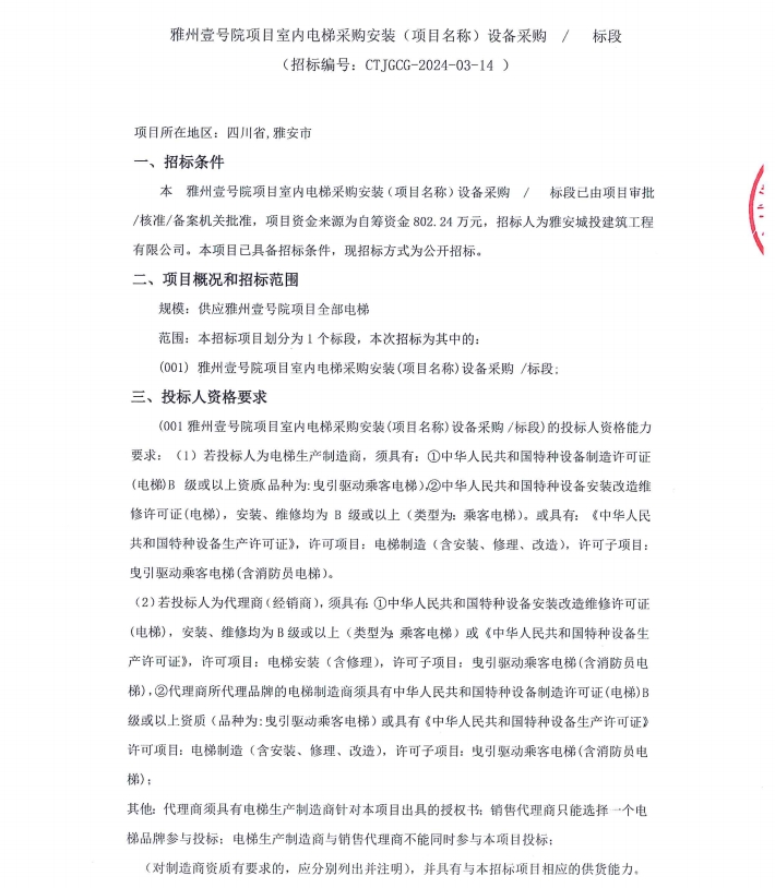 雅州壹號院項目室內(nèi)電梯采購安裝(項目名稱)設(shè)備采購/標(biāo)段公告