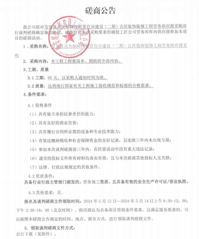 寶興縣靈關(guān)保障性租賃住房建設(shè)(二期)公區(qū)裝飾裝修工程勞務(wù)供應(yīng)商采購談判磋商公告