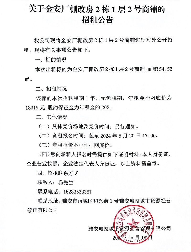 關(guān)于金安廠棚改房2棟1層2號商鋪的招租公告