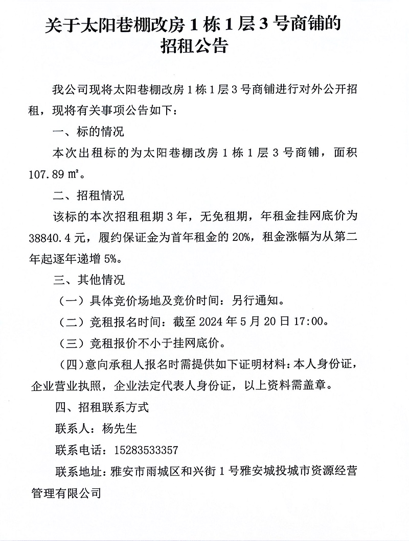 關于太陽巷棚改房1棟1層3號商鋪的招租公告
