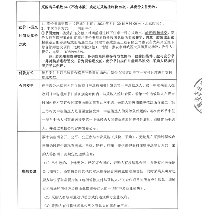 雅安市大興片區(qū)地下綜合管廊建設(shè)項(xiàng)目道路專業(yè)分包欄桿采購競價(jià)公告