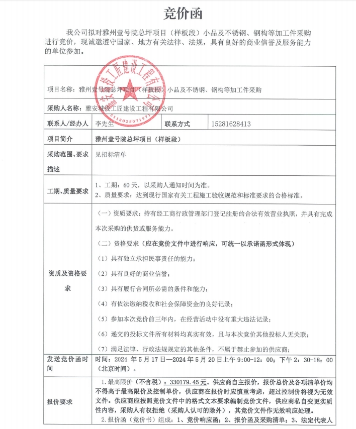 雅州壹號院總坪項目(樣板段)小品及不銹鋼、鋼構(gòu)等加工件采購競價公告