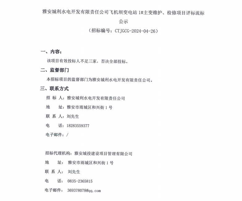 雅安城利水電開(kāi)發(fā)有限責(zé)任公司飛機(jī)壩變電站1#主變維護(hù)、檢修項(xiàng)目評(píng)標(biāo)流標(biāo)公示