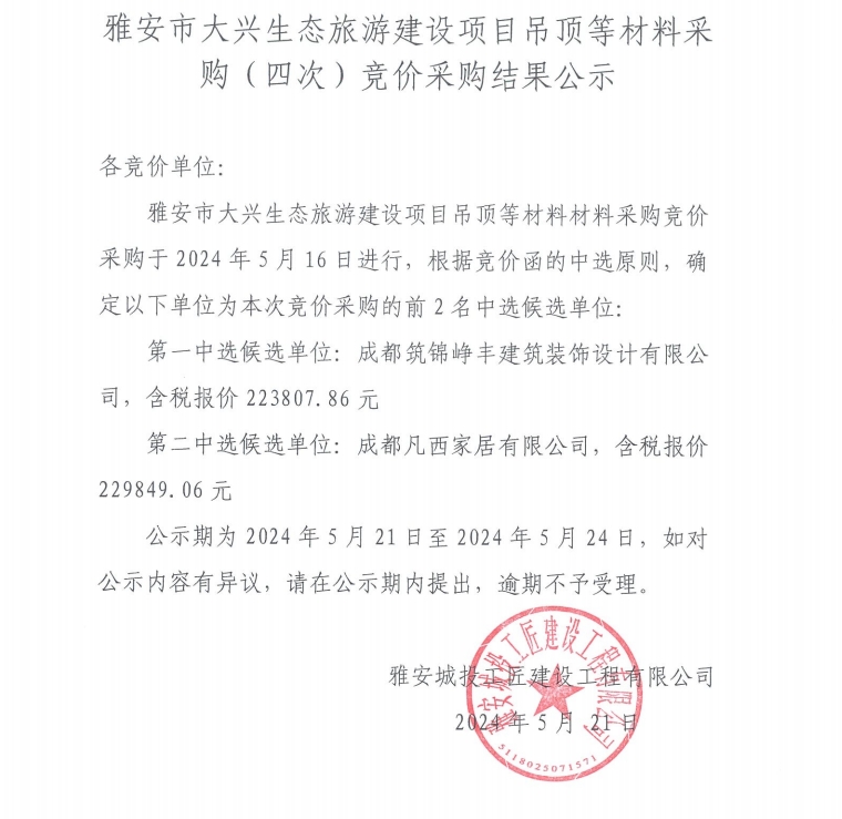 雅安市大興生態(tài)旅游建設(shè)項(xiàng)目吊頂?shù)炔牧喜少?gòu)(四次)競(jìng)價(jià)采購(gòu)結(jié)果公示