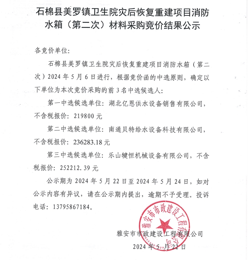 石棉縣美羅鎮(zhèn)衛(wèi)生院災(zāi)后恢復(fù)重建項目消防水箱(第二次)材料采購競價結(jié)果公示