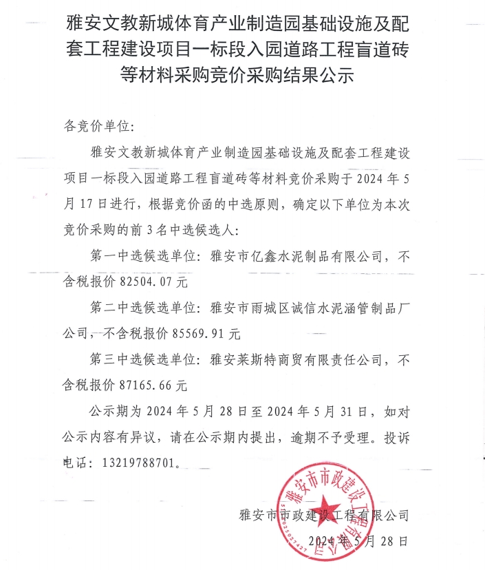 雅安文教新城體育產(chǎn)業(yè)制造園基礎(chǔ)設(shè)施及配套工程建設(shè)項目一標段入園道路工程盲道磚等材料采購競價采購結(jié)果公示