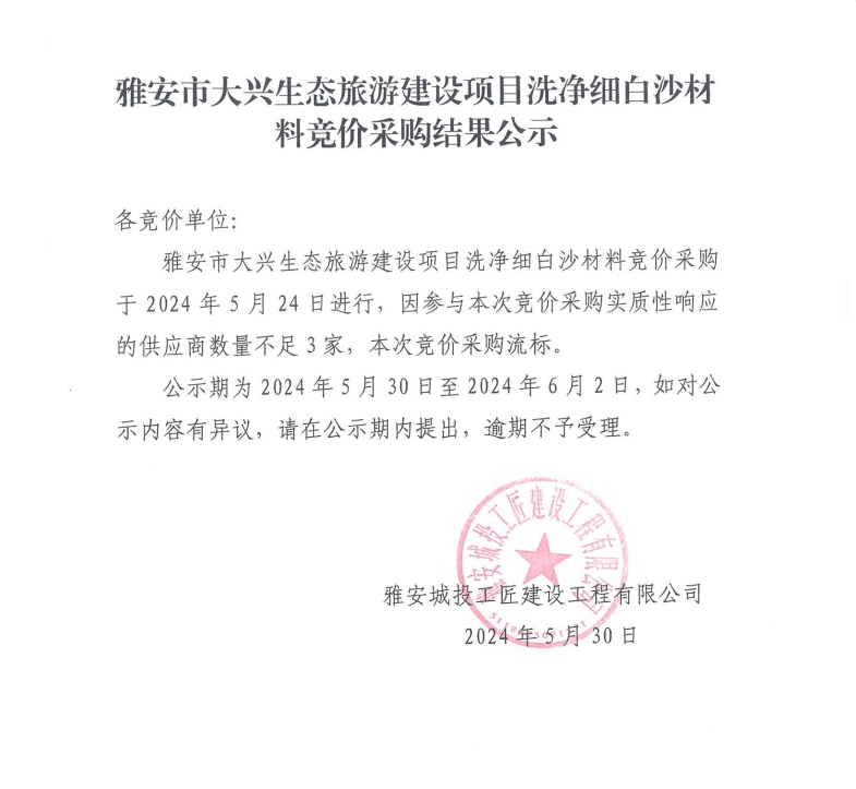 雅安市大興生態(tài)旅游建設(shè)項(xiàng)目洗凈細(xì)白沙材料競(jìng)價(jià)采購結(jié)果公示