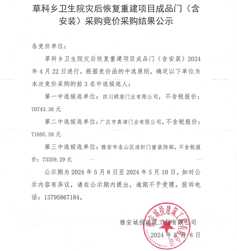 草科鄉(xiāng)衛(wèi)生院災(zāi)后恢復(fù)重建項(xiàng)目成品門(含安裝)采購競價采購結(jié)果公示