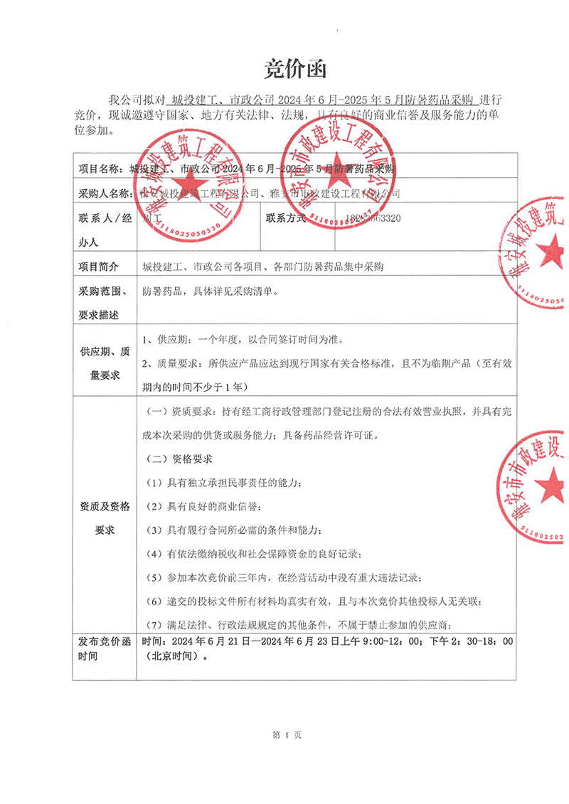 城投建工、市政公司2024年6月-2025年5月防暑藥品采購競價函
