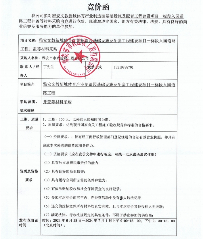 雅安文教新城體育產(chǎn)業(yè)制造園基礎(chǔ)設(shè)施及配套工程建設(shè)項(xiàng)目一標(biāo)段入園道路工程項(xiàng)目井蓋等材料采購競價公告