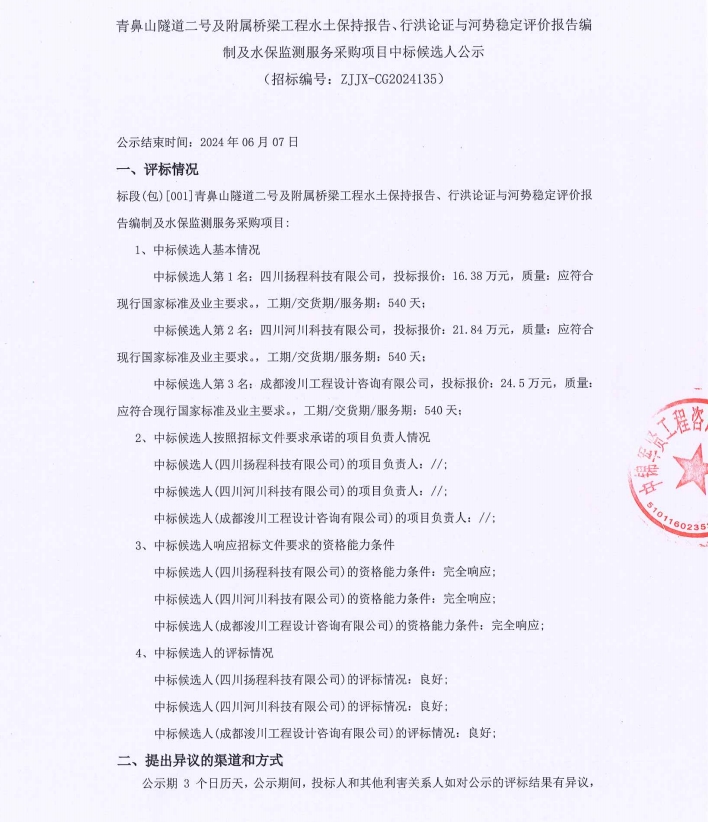 青鼻山隧道二號及附屬橋梁工程水土保持報告、行洪論證與河勢穩(wěn)定評價報告編制及水保監(jiān)測服務(wù)采購項目中標(biāo)候選人公示