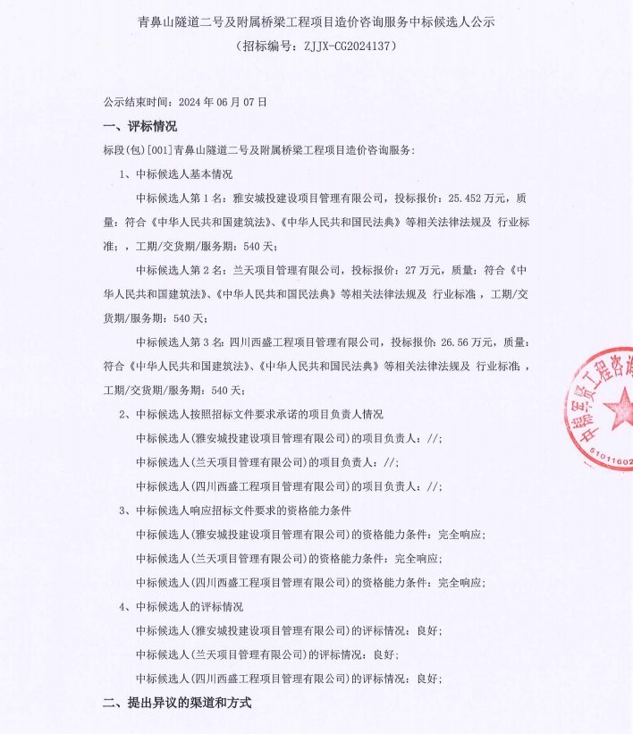 青鼻山隧道二號及附屬橋梁工程項目造價咨詢服務(wù)中標(biāo)候選人公示