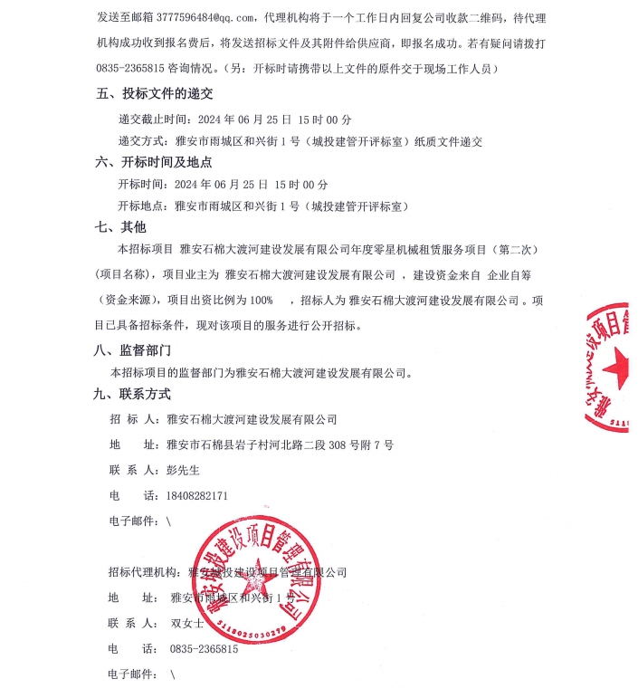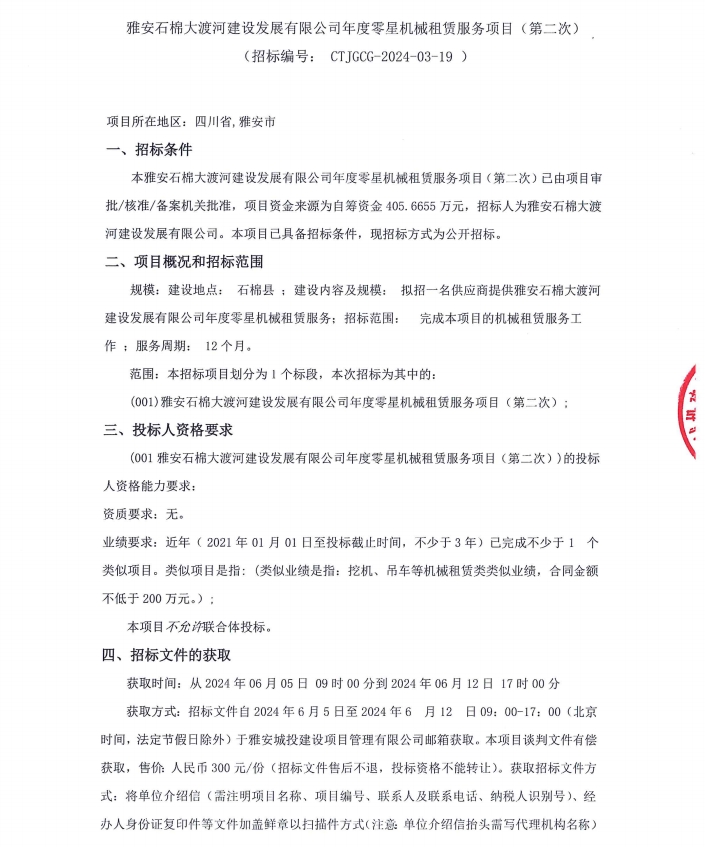 雅安石棉大渡河建設發(fā)展有限公司年度零星機械租賃服務項目(第二次)招標公告