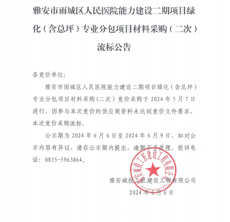 雅安市雨城區(qū)人民醫(yī)院能力建設二期項目綠化(含總坪)專業(yè)分包材料采購(二次)流標公告