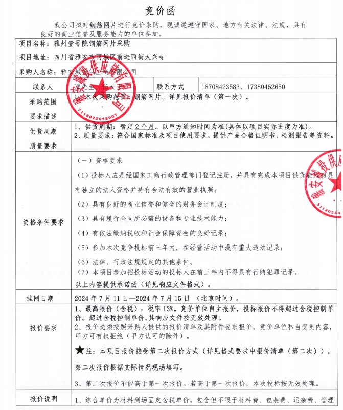 競價函--雅州壹號院鋼筋網片采購