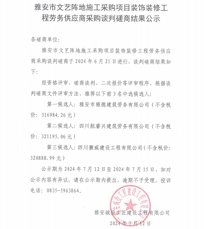 雅安市文藝陣地施工采購項目裝飾裝修工程勞務供應商采購談判磋商結果公示