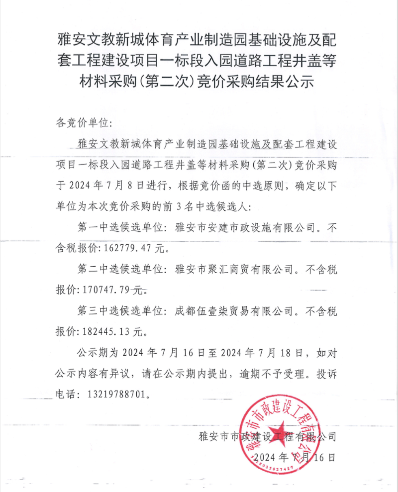 雅安文教新城體育產(chǎn)業(yè)制造園基礎(chǔ)設(shè)施及配套工程建設(shè)項(xiàng)目一標(biāo)段入園道路工程井蓋等材料采購(第二次)競(jìng)價(jià)采購結(jié)果公示