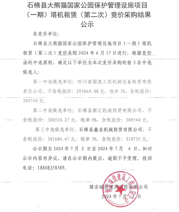 石棉縣大熊貓國家公園保護(hù)管理設(shè)施項(xiàng)目(一期)塔機(jī)租賃(第二次)競價(jià)采購結(jié)果公示