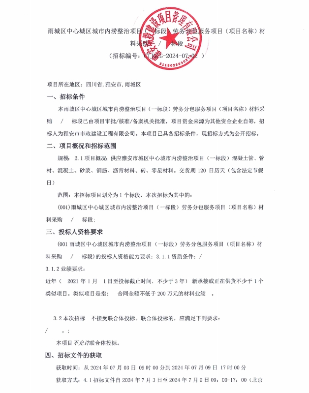 雅安市城區(qū)中心城市內(nèi)澇整治項目(一標段)勞務分包服務項目(項目名稱)材料采購招標公告