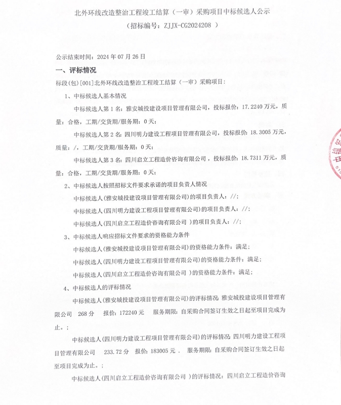 北外環(huán)線改造整治工程竣工結(jié)算(一審)采購(gòu)項(xiàng)目中標(biāo)候選人公示