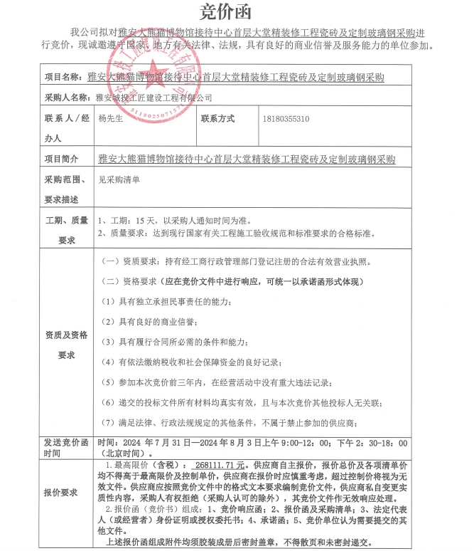 雅安大熊貓博物館接待中心首層大堂精裝修工程瓷磚及定制玻璃鋼采購競價(jià)公告