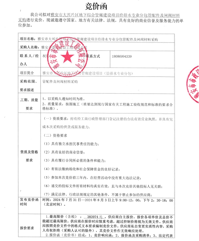 雅安市大興片區(qū)地下綜合管廊建設(shè)項(xiàng)目給排水專業(yè)分包管配件及閘閥材料采購(gòu)競(jìng)價(jià)公告