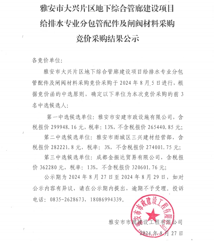 雅安市大興片區(qū)地下綜合管廊建設項目給排水專業(yè)分包管配件及閘閥材料采購結果公示