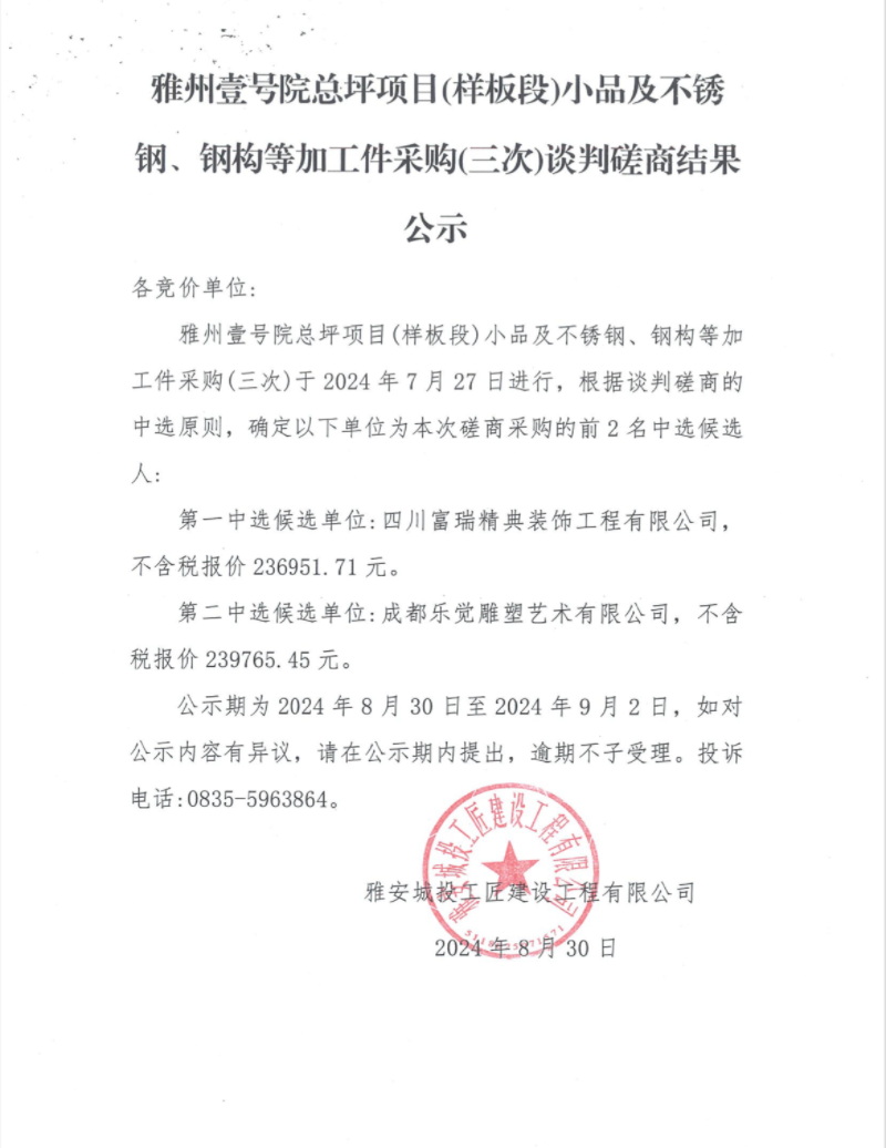 雅州壹號院總坪項目(樣板段)小品及不銹鋼、鋼構(gòu)等加工件采購(三次)談判磋商結(jié)果公示