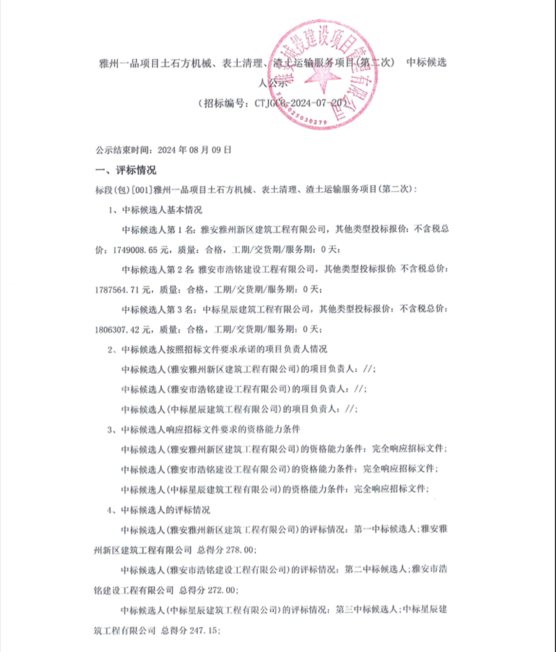 雅州一品項目土石方機械、表土清理、清土運輸服務(wù)項目(第二次)中標候選人公示
