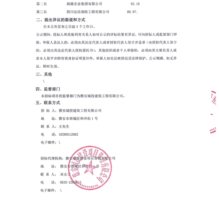雅州壹號院消防及防排煙工程中標(biāo)候選人公示