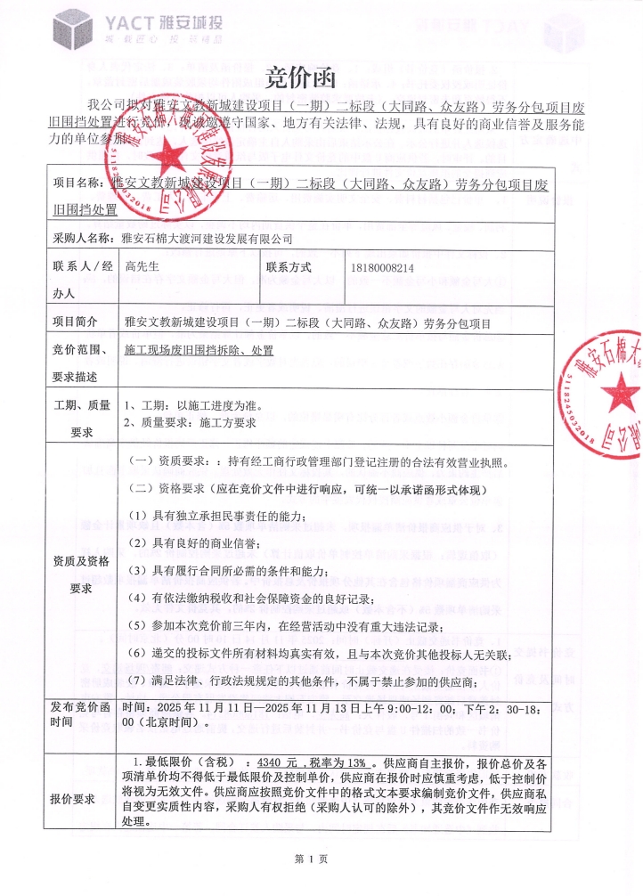 雅安文教新城建設(shè)項目(一期)二標(biāo)段(大同路、眾友路)勞務(wù)分包項目廢舊圍擋處置競價公告