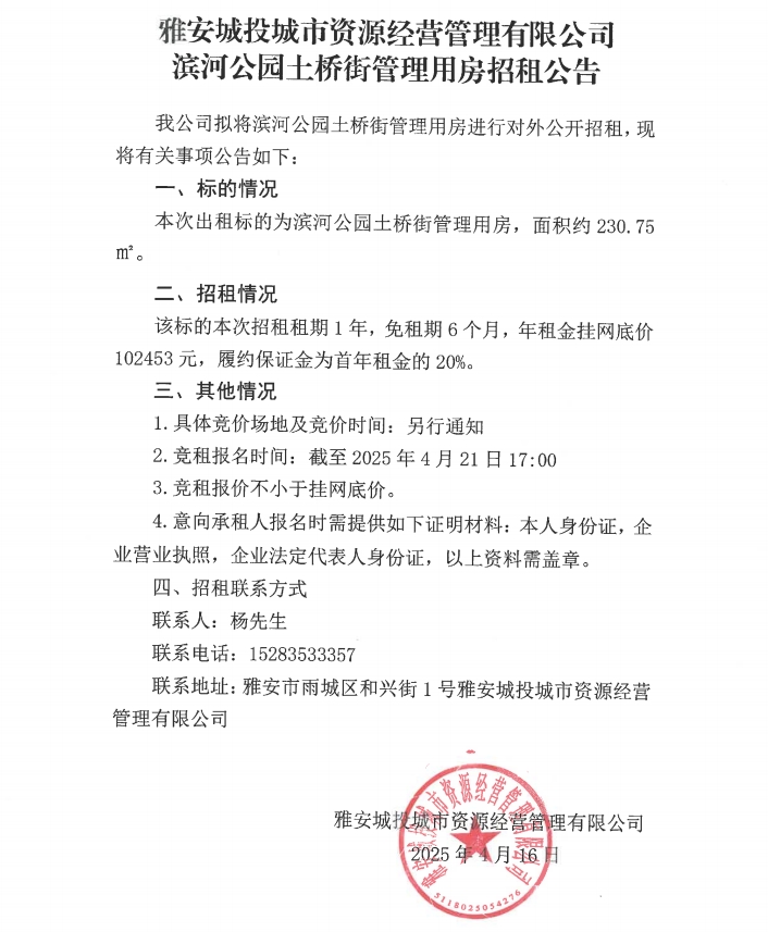 雅安城投城市資源經(jīng)營管理有限公司濱河公園土橋街管理用房招租公告