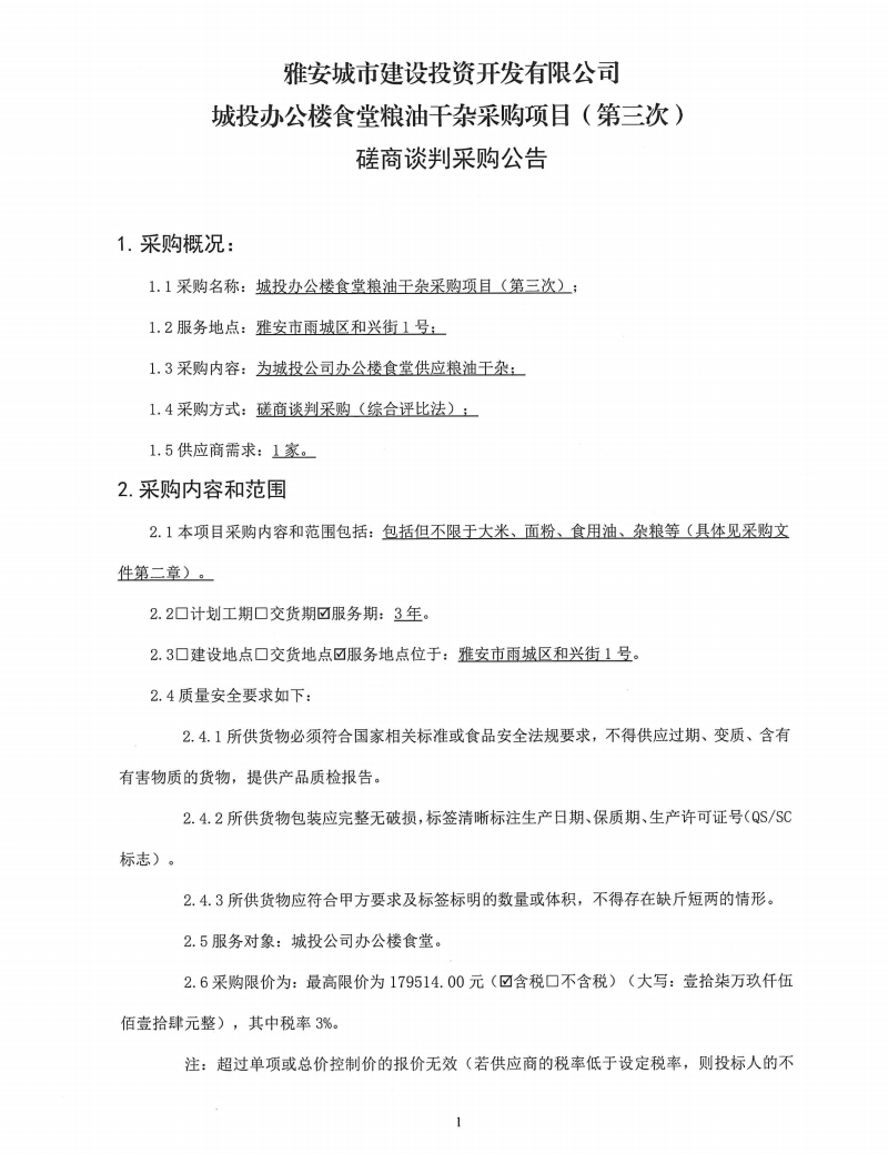 雅安城市建設投資開發(fā)有限公司城投辦公樓食堂糧油干雜采購項目(第三次)磋商談判采購公告