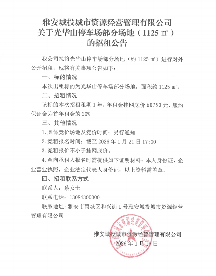 雅安城投城市資源經(jīng)營(yíng)管理有限公司關(guān)于光華山停車場(chǎng)部分場(chǎng)地(1125㎡)的招租公告