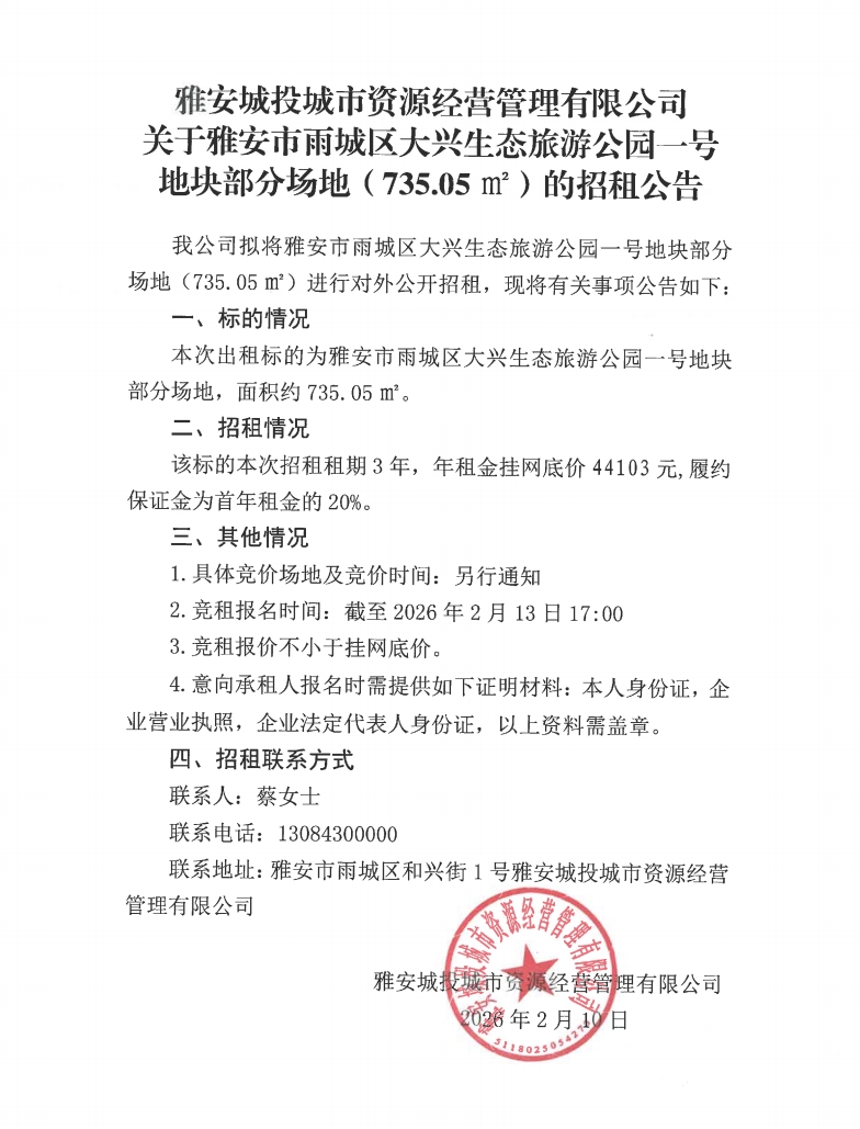 雅安城投城市資源經(jīng)營管理有限公司關(guān)于雅安市雨城區(qū)大興生態(tài)旅游公園一號地塊部分場地(735.05㎡)的招租公告