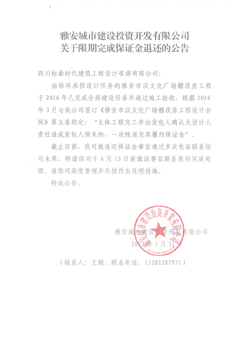 雅安城市建設投資開發(fā)有限公司關(guān)于限期完成保證金退還的公告
