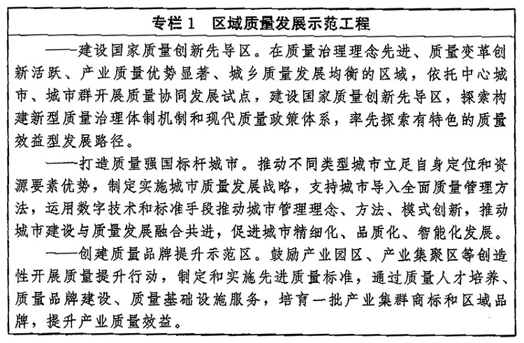 (九)打造區(qū)域質(zhì)量發(fā)展新優(yōu)勢。加強質(zhì)量政策引導,推動區(qū)域質(zhì)量發(fā)展與生產(chǎn)力布局、區(qū)位優(yōu)勢、環(huán)境承載能力及社會發(fā)展需求對接融合。推動東部地區(qū)發(fā)揮質(zhì)量變革創(chuàng)新的引領(lǐng)帶動作用,增強質(zhì)量競爭新優(yōu)勢,實現(xiàn)整體質(zhì)量提升。引導中西部地區(qū)因地制宜發(fā)展特色產(chǎn)業(yè),促進區(qū)域內(nèi)支柱產(chǎn)業(yè)質(zhì)量升級,培育形成質(zhì)量發(fā)展比較優(yōu)勢。推動東北地區(qū)優(yōu)化質(zhì)量發(fā)展環(huán)境,加快新舊動能轉(zhuǎn)換,促進產(chǎn)業(yè)改造升級和質(zhì)量振興。健全區(qū)域質(zhì)量合作互助機制,推動區(qū)域質(zhì)量協(xié)同發(fā)展。深化質(zhì)量強省建設(shè),推動質(zhì)量強市、質(zhì)量強業(yè)向縱深發(fā)展,打造質(zhì)量強國建設(shè)標桿。